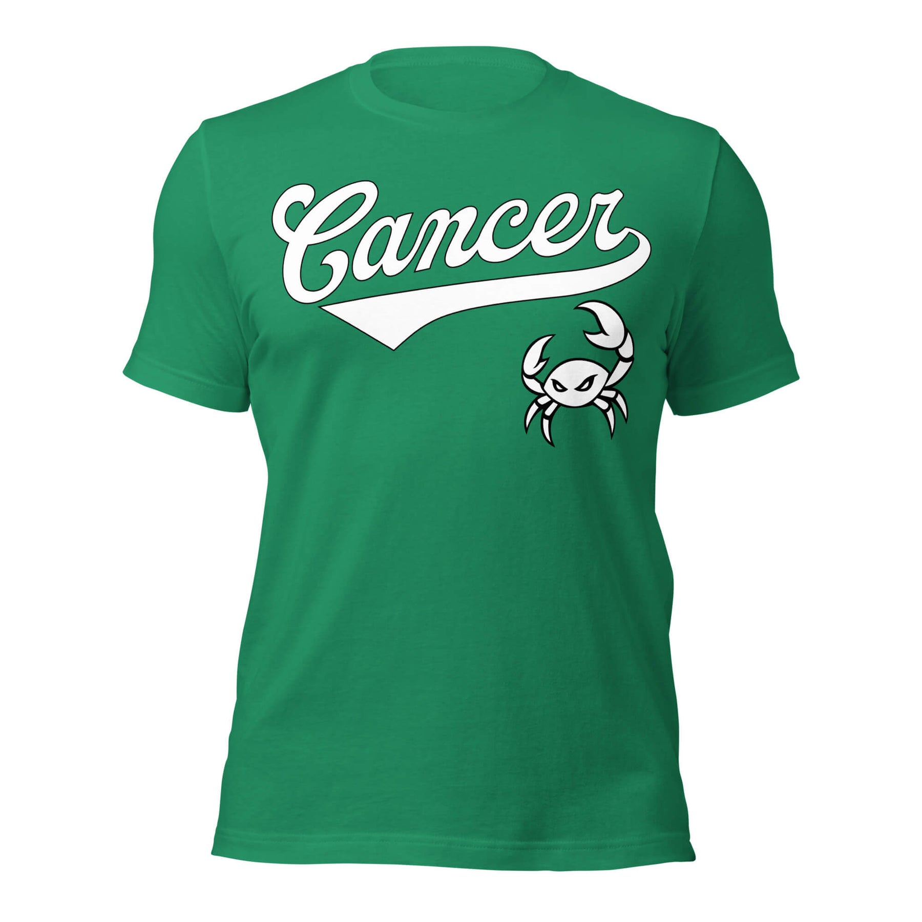 Green t-shirt with 'Cancer' and a crab graphic on a white background. Green Shirt / White Ink variant