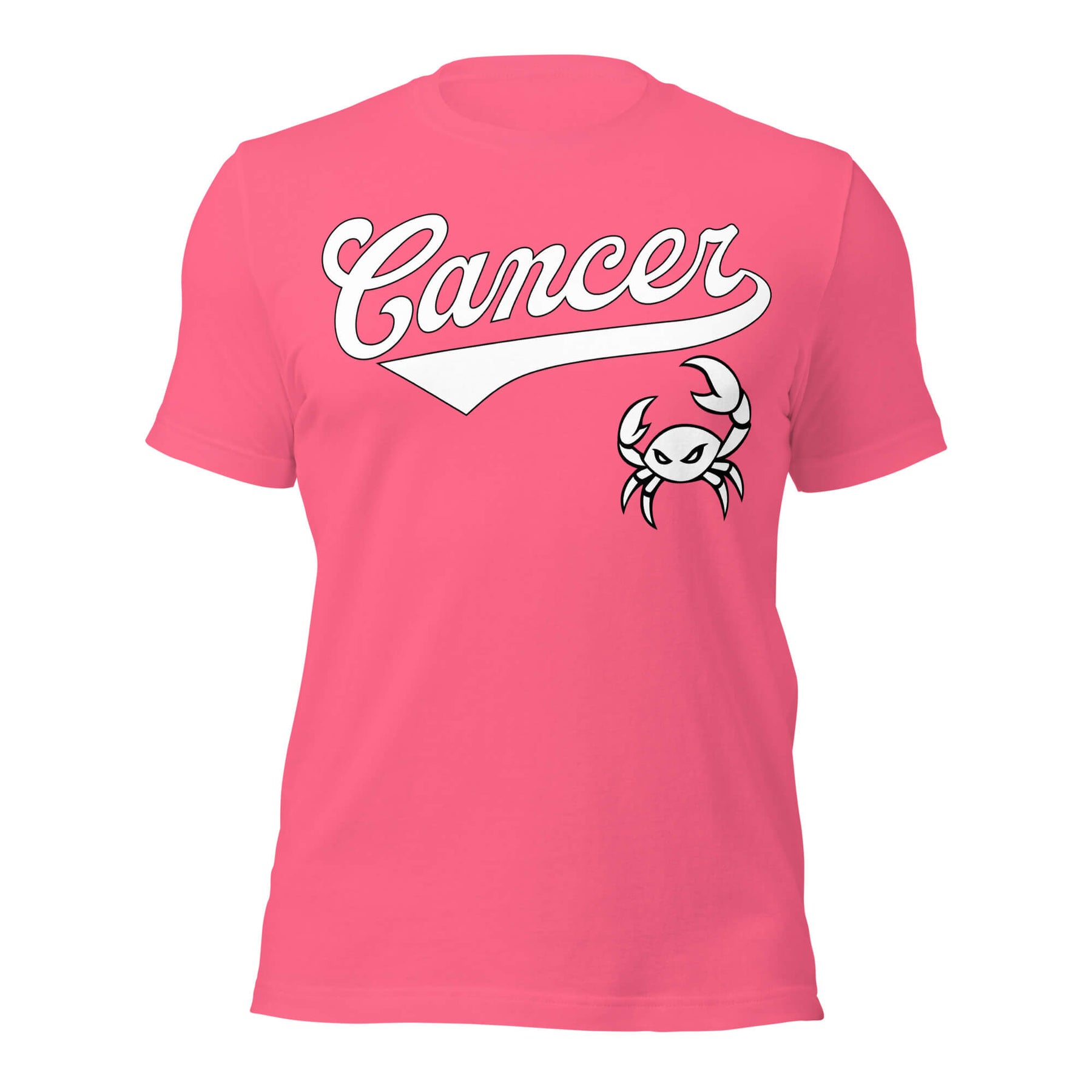 Pink t-shirt with 'Cancer' and a crab graphic on a white background. Pink Shirt / White Ink variant