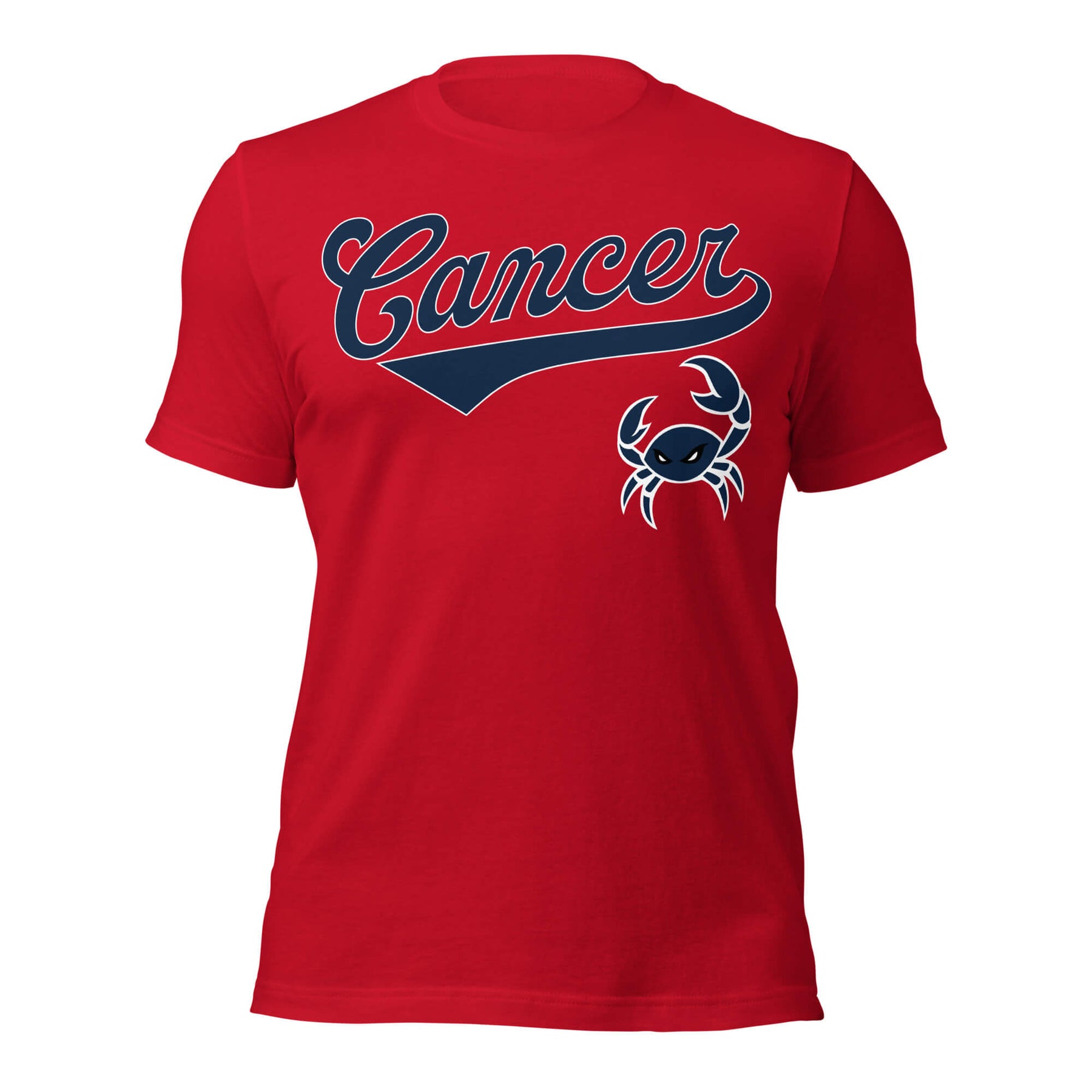 Red t-shirt with 'Cancer' and a crab graphic on a white background. Red Shirt / Blue Ink variant