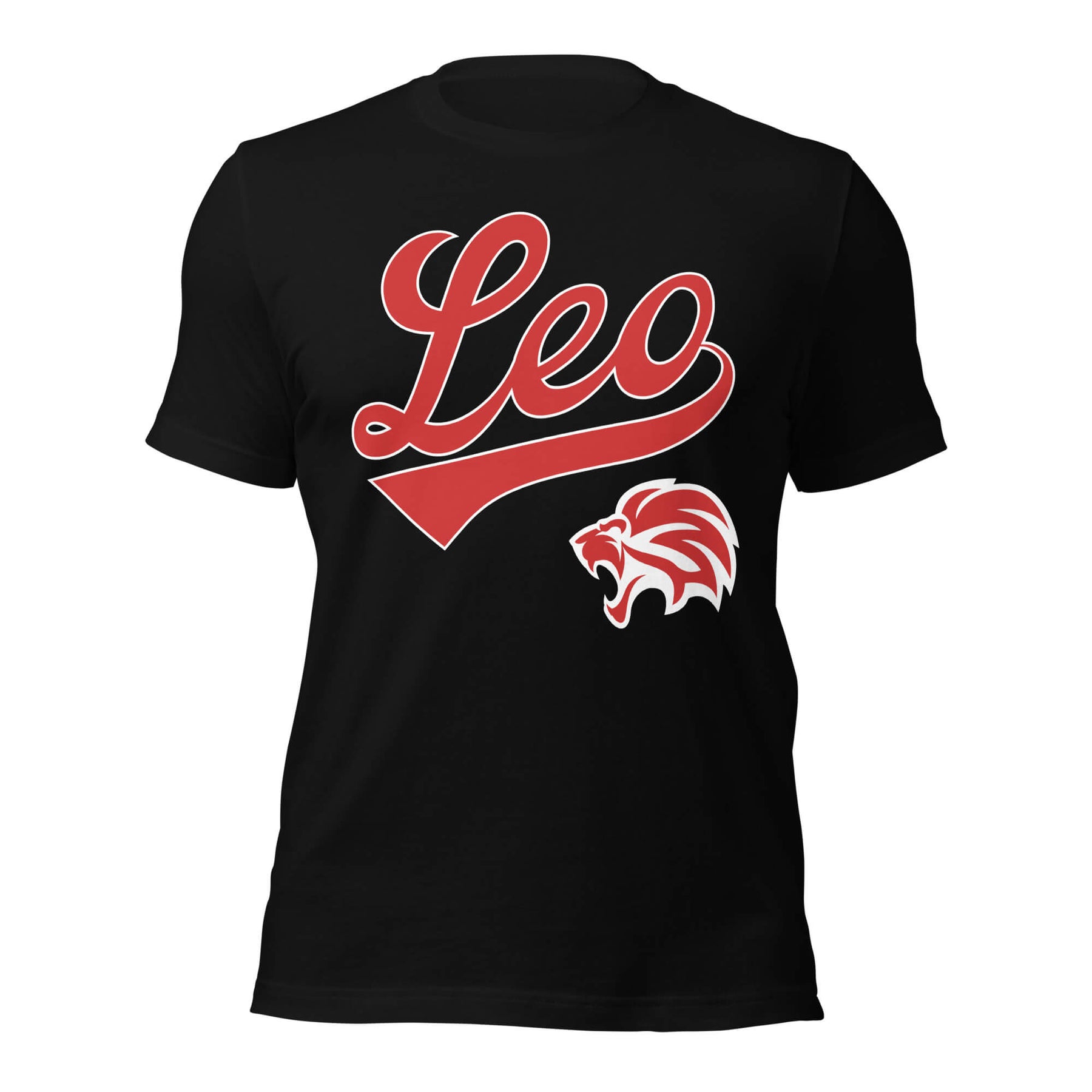 Red t-shirt with 'Leo' and lion graphic on a white background. Red Shirt / Blue Ink variant.