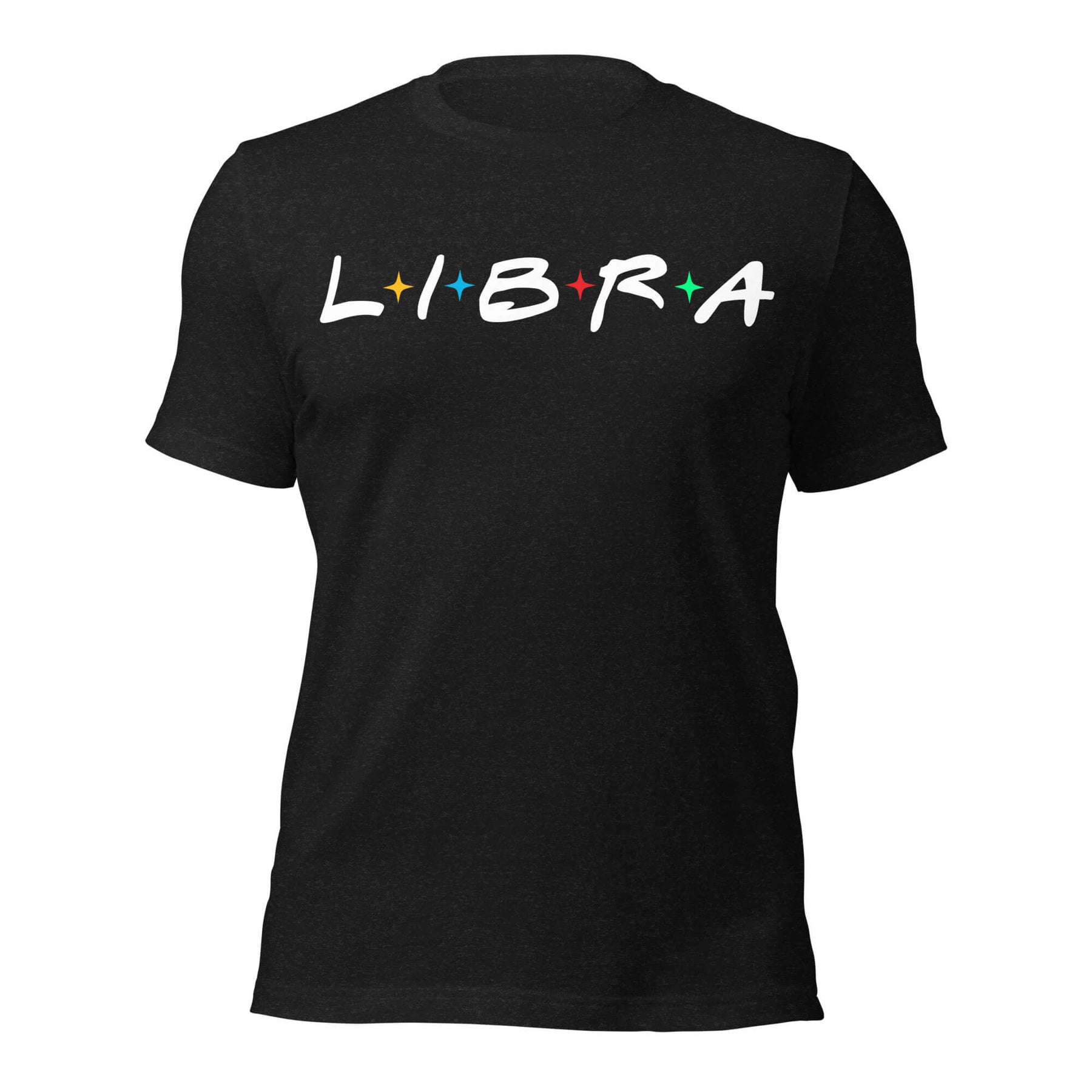 Two people wearing black t-shirts with 'LIBRA' text on a white background